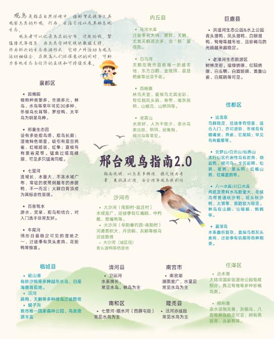 本版指南覆盖了信都区、襄都区、内丘县等11个县(市、区)的30余处观鸟点位。分别为: