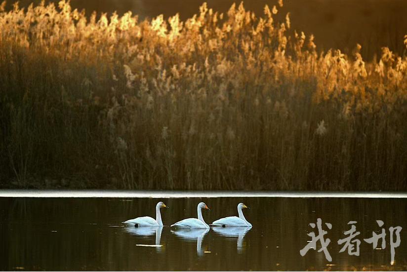 天鹅在我市目前唯一的越冬地,东方白鹳、金斑鸻、震旦鸦雀等出没于此。